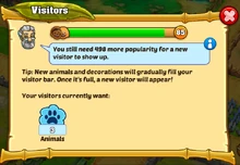 Visitor Level is very probable the most important aspect of the game. A zoo'due south visitor level indicates how many visitors are currently coming to your zoo. The higher the number, the more visitors, which of course, means more coins nerveless not just at the archway gate, but also at all of your shops. Visitors volition also generate "trash" which provide a small-scale amount of experience points for y'all when collected.